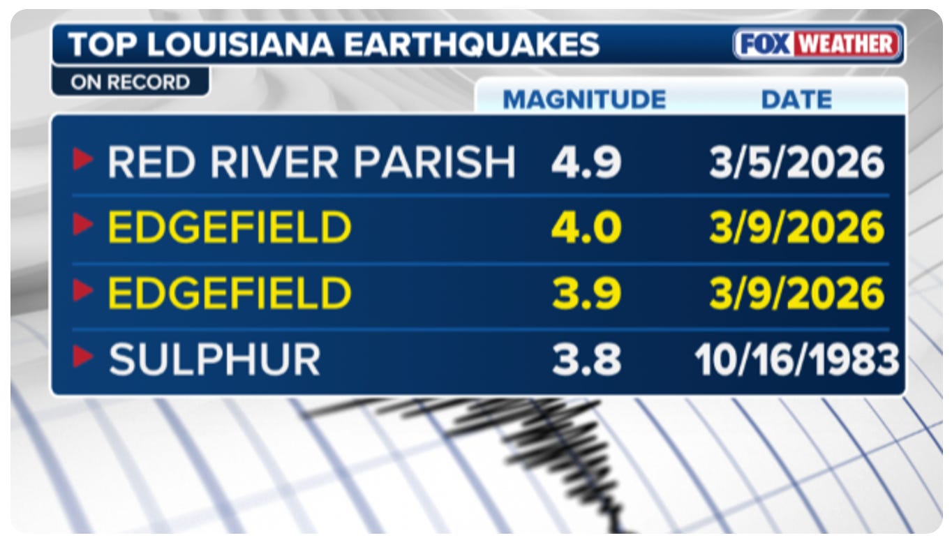 4 FREAKING EARTHQUAKES IN THE SAME AREA of Louisiana. Tossing the 80s record down to 4th place in a matter of days. WOW! Trails more mild today, but NEXRAD still strong in these severe storms.